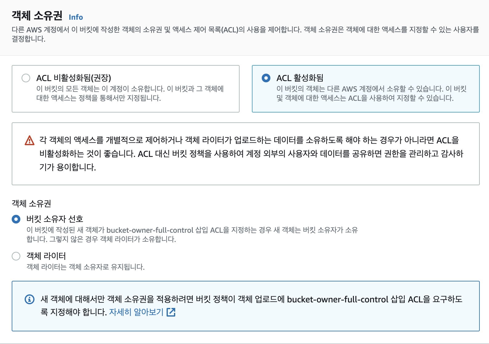 객체 소유권은 ACL 활성화됨 으로 선택하고 객체 소유권은 버킷 소유자 선호로 설정하였다.